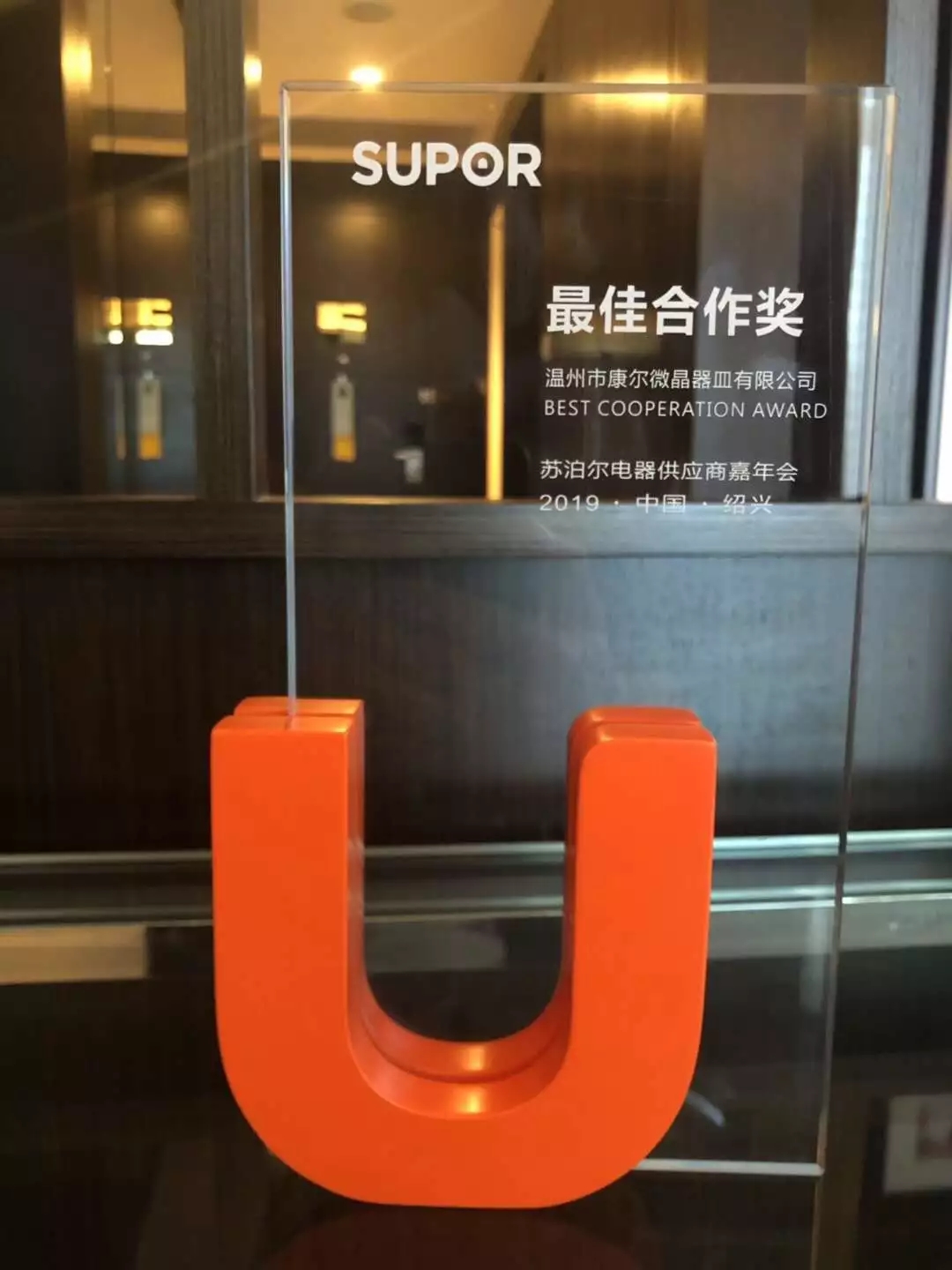 康爾微晶玻璃憑借著優質的產品和服務,以始終堅持以客戶為中心、快速響應市場需求,堅持“工匠精神”、恪守品質,助力客戶“精品戰略”,從眾多供應商中脫穎而出,榮獲蘇泊爾“最佳合作獎”。
