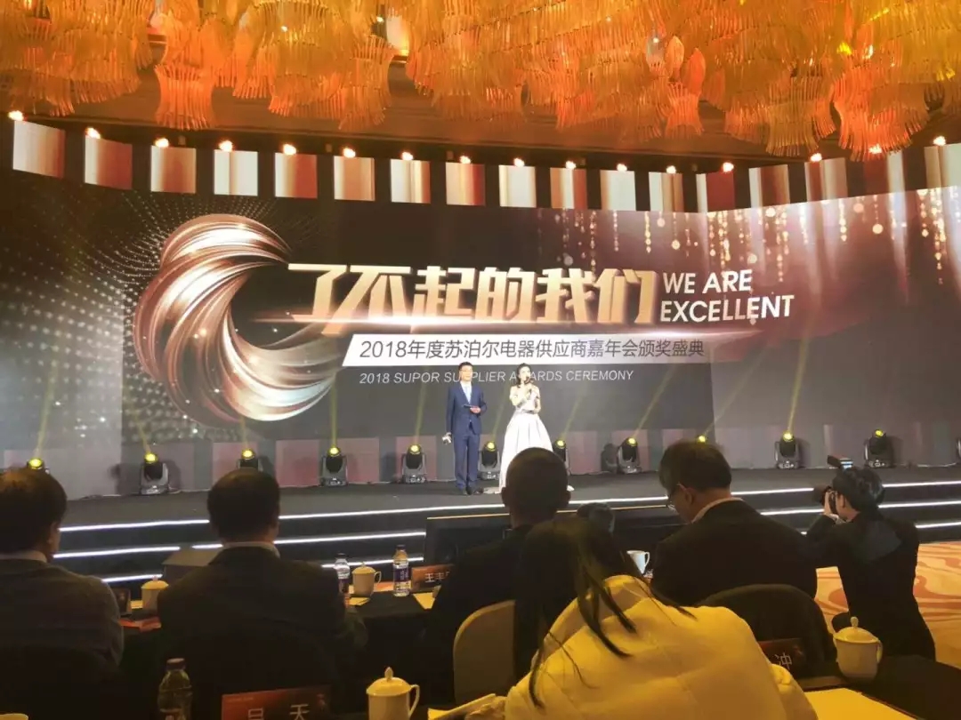 2019年1月23日,以“齊心合力、贏未來”為主題的“2018年度蘇泊爾電器供應商嘉年會頒獎盛典”,在江南水鄉紹興世茂皇冠假日酒店召開。我司總經理楊明星及副總經理傅克早應邀出席了本次盛典。
